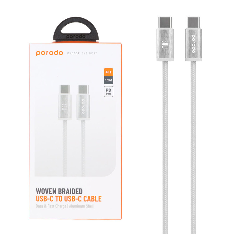 کابل شارژ 1.2 متری PD و فست Porodo Type-C To Type-C 60W مدل PD-W60CC1-WH - سفید